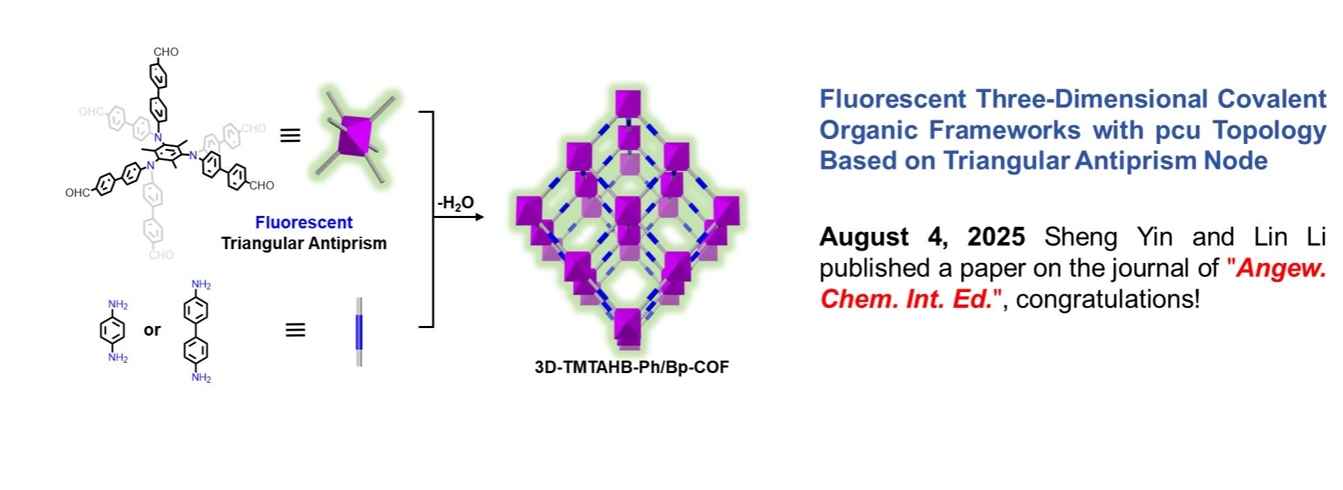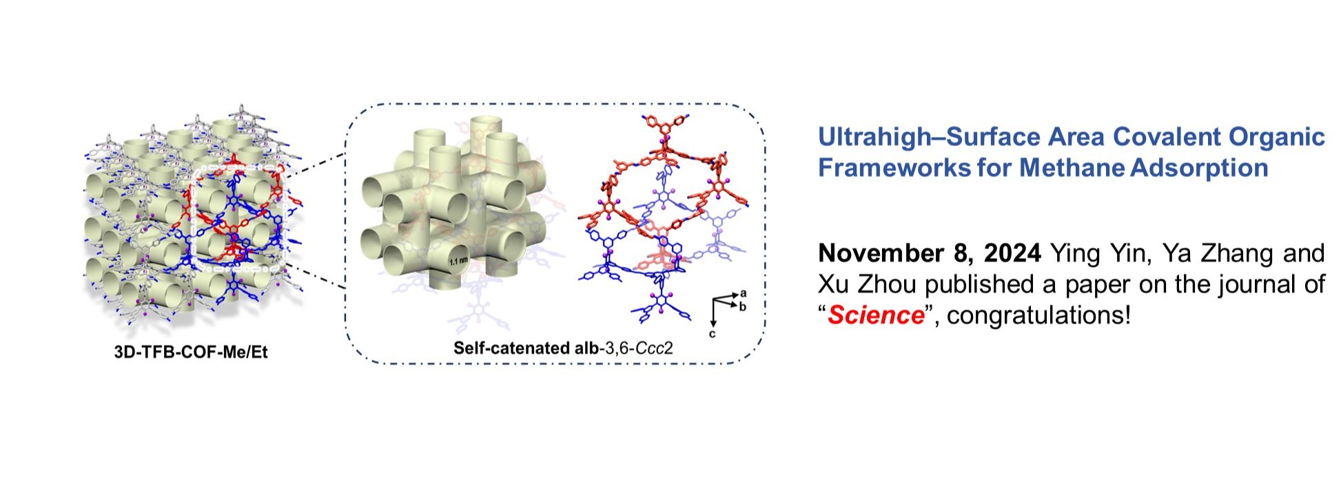 The development of new porous materials is of great significance. Our laboratory focuses on 3D covalent organic frameworks (COFs), a unique class of crystalline porous materials formed by linking organic building blocks into 3D networks through covalent bonds. We specialize in their design and synthesis, as well as exploring their applications in mole-cular storage, separation, sensing, and catalysis. We warmly welcome enthusiastic, positive, and likeminded students to join our team!
